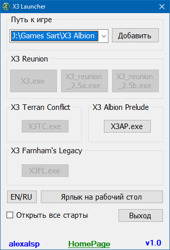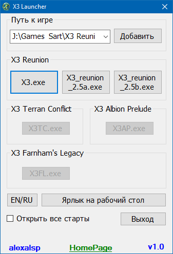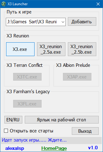 Авторские права - X3 Game Launcher разработан для сообщества игроков - Все права на игры X3 принадлежат Egosoft - Программа не содержит кода из оригинальных игр