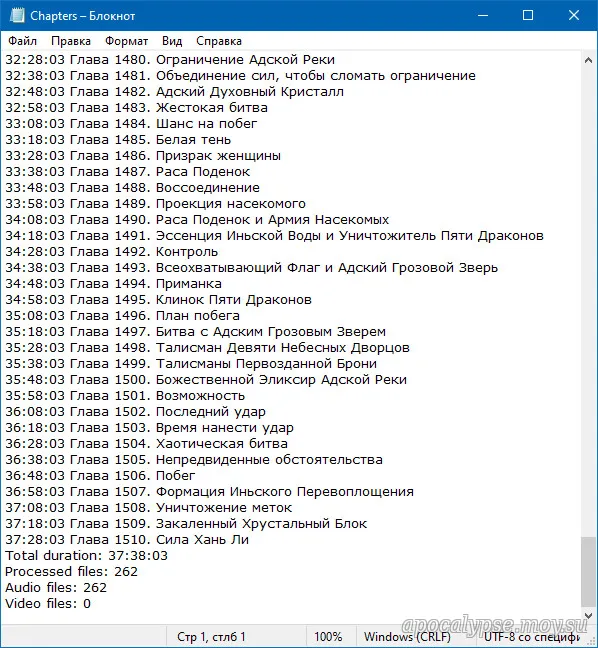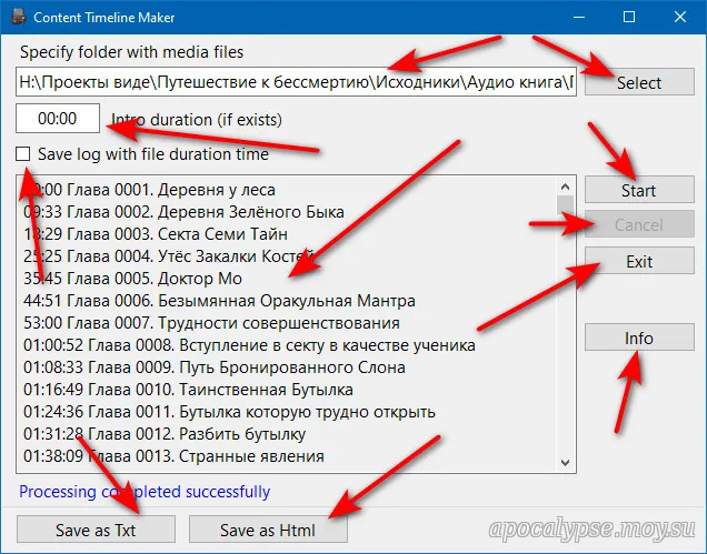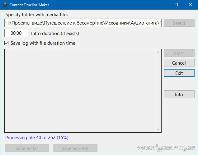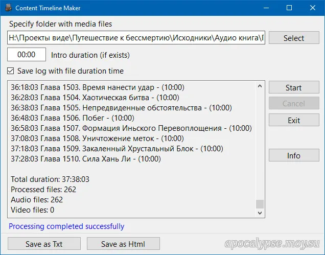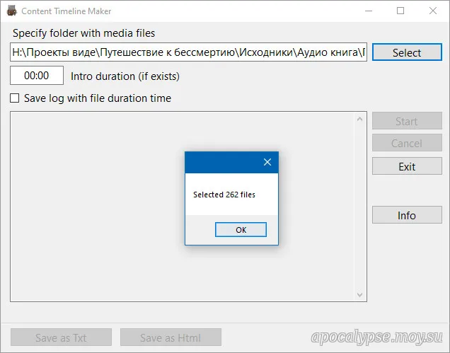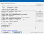 Описание: Программа создаёт список содержания аудиофайлов с указанием времени начала каждого трека. Поддерживается ввод времени заставки перед первым треком. Поддерживаются форматы MP3, WAV и OGG. Логи формируются в виде временных меток часы:минуты:секунды с именем файла.