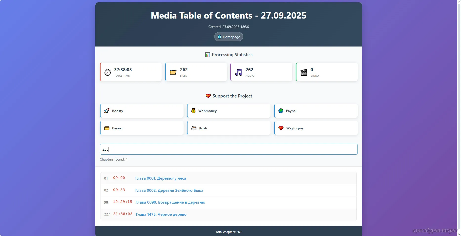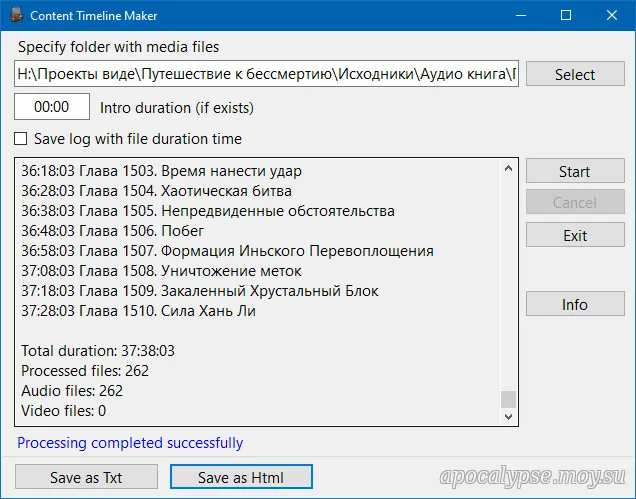 Назначение: Генерация временных меток для видео, подкастов, аудиокниг и других проектов, где важно точное указание времени начала каждого аудиофайла.