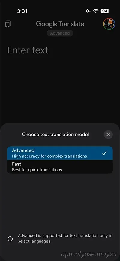 Опция этой функции отображается под логотипом Google Translate в верхней части приложения. Расширенный вариант установлен по умолчанию и отображается первым. При нажатии на клавишу в форме таблетки ниже открывается новая панель «Выберите модель перевода текста»: