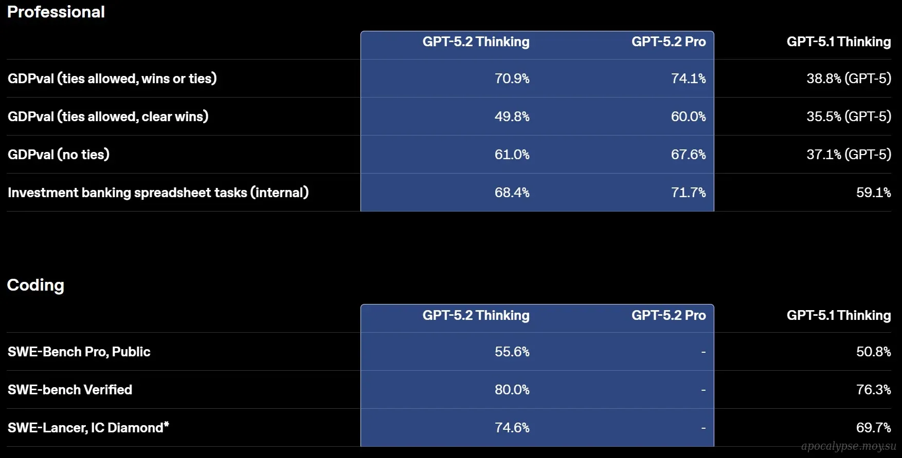 OpenAI утверждает, что GPT-5.2 Thinking даёт более точные ответы, чем люди-профессионалы, в 71 % задач по 44 отраслям. Также она генерирует на 38 % меньше галлюцинаций, чем её предшественница GPT-5.1. Также GPT-5.2 Thinking установила новые рекорды в бенчмарках, включая SWE-Bench Pro (в агентном кодировании) и GPQA Diamond (в научном мышлении).
