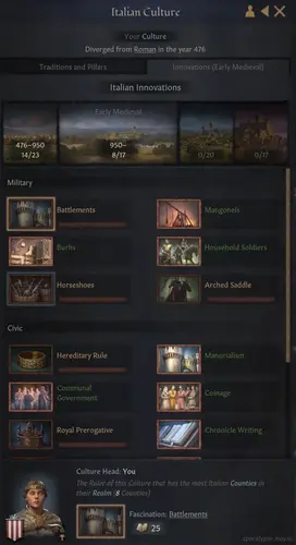 Бесплатный патч 1.18 "Crane" тоже вносит много нового: переработанная карта с реками и шахтами, улучшенный UI, новые эмблемы (400 штук!) и структура инноваций с fascination. Теперь дома целиком могут быть дружественными или враждебными, что делает династические отношения ещё глубже.