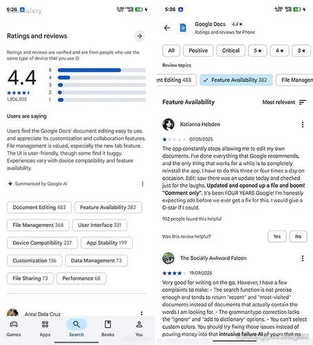 Компания Google начала поэтапный запуск функции искусственного интеллекта (ИИ), генерирующей сводки отзывов пользователей в магазине приложений Google Play Store на платформе Android. Эта функция отображается в разделе «Рейтинги и отзывы» и далее в подразделе «Пользователи говорят». Опция доступна только для приложений, набравших достаточное количество оценок, но точный порог значений Google не раскрывает.
