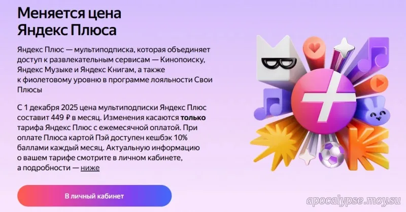 «С первого декабря 2025 года цена мультиподписки «Яндекс Плюс» составит 449 рублей в месяц. Изменения касаются только тарифа «Яндекс Плюс» с ежемесячной оплатой», — говорится в сообщении сервиса.