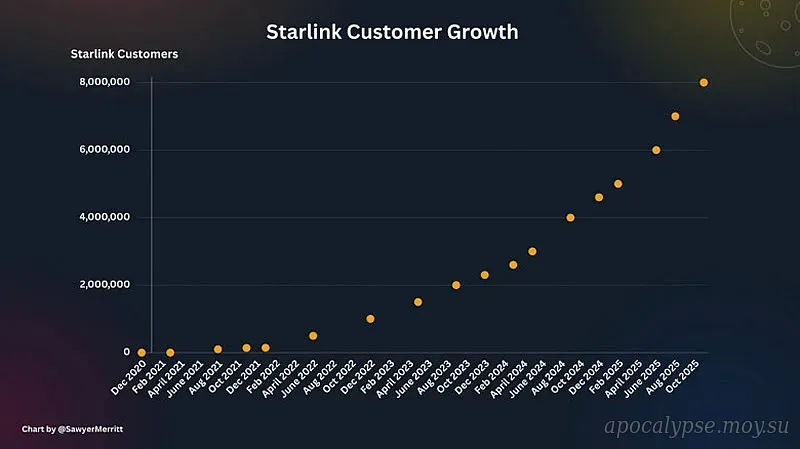 Спутниковый интернет-сервис Starlink компании SpaceX достиг отметки более чем в 8 миллионов активных пользователей, сообщает Habr со ссылкой на пост в X инвестора Tesla Сойера Меррита (Sawyer Merritt). По его данным, ещё в августе 2025 года число клиентов сервиса составляло 7 миллионов, а месяцем ранее, в июне — 6 миллионов.