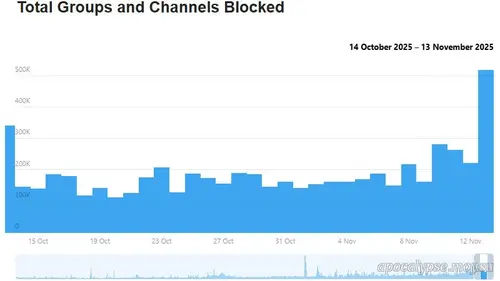 За вчерашний день, 13 ноября 2025 года, администрация мессенджера Telegram заблокировала 519 645 каналов. Это рекордный показатель по блокировке ресурсов на платформе за всё время сбора статистики.