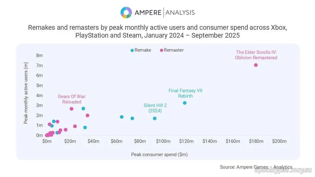 По данным Ampere Analysis, ремейки и переиздания 2024 и 2025 годов привлекли 72,4 млн пользователей Steam, PlayStation и Xbox. Суммарно потребители потратили на покупку игр (и микротранзакции в них) более $1,4 млрд.