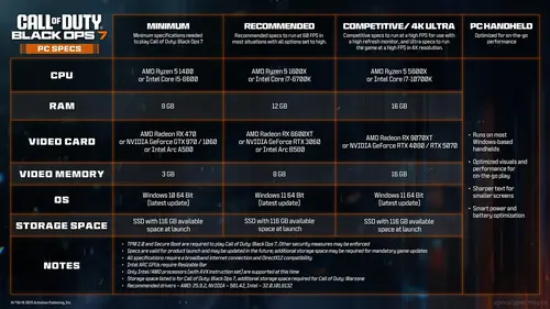 Что касается системных требований, то Call of Duty: Black Ops 7 запустится на ПК с процессором уровня Intel Core i5-6600, видеокартой Nvidia GeForce GTX 970/1060, 8 Гбайт оперативной памяти и 115 Гбайт места на SSD.