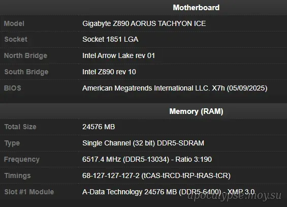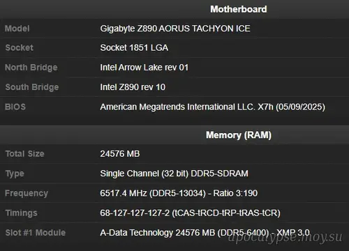 Согласно последним данным, теперь уже предыдущий рекорд разгона оперативной памяти, который соответствовал режиму DDR5-13010, был установлен с использованием материнской платы Gigabyte Z890 Aorus Tachyon Ice и центрального процессора Intel Core Ultra 9 285K семейства Arrow Lake. Это сочетание в руках «придворного» энтузиаста Gigabyte позволило обновить рекорд до DDR5-13034.