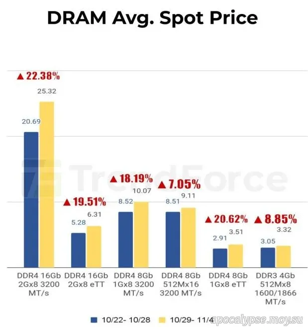 Проведенный анализ показал, что в условиях, когда рыночный спрос существенно опережает предложение со стороны производителей, микросхемы памяти резко прибавляют в цене на спотовом рынке. С конца октября по 4 ноября включительно стоимость контрактов на DDR5 подскочила на 30%, а DDR4 подорожала вплоть до 22%, о чем сообщает аналитическая компания TrendForce.