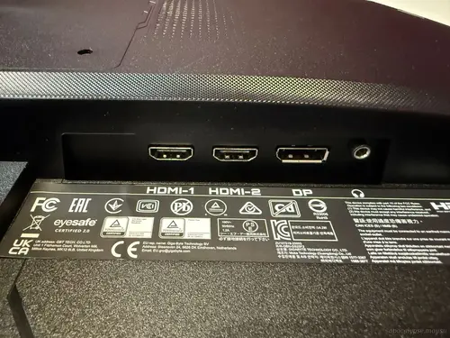Набор портов для подключения монитора к источникам видеосигнала представлен двумя портами HDMI 2.0 и одним – DisplayPort 1.4, а еще в наличии один 3,5-мм TRS-разъем для подключения наушников/гарнитуры. Строго говоря, большего нам и не нужно.