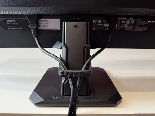 Внешний вид GS25F2 отражает его внутреннюю суть – никакого надуманного “пафоса”, все аппаратные ресурсы вложены во “внутренности”. Дизайн конструктива минималистичный, тем не менее, на подставке можно обнаружить едва заметное напоминание об игровой сущности дисплея. Корпус выполнен из матового черного пластика, рамки контура матрицы тонкие, а для подставки оставили только одну степень свободы – регулировка угла наклона от/к пользователю в пределах -5° … +20. В этом контексте отметим исключительную устойчивость монитора за счет монументального основания.