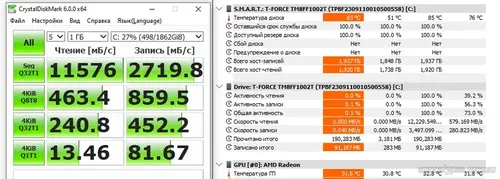 Что же до температур, при отсутствия внешнего охлаждения SSD под постоянной пиковой нагрузкой прогревается до внушительных 85 градусов, что, будем честны, довольно много, но и достаточно ожидаемо – все PCIe 5.0 и многие SSD предыдущих поколений сильно греются сами по себе. Максимальная температура и самые низкие показатели скорости работы.