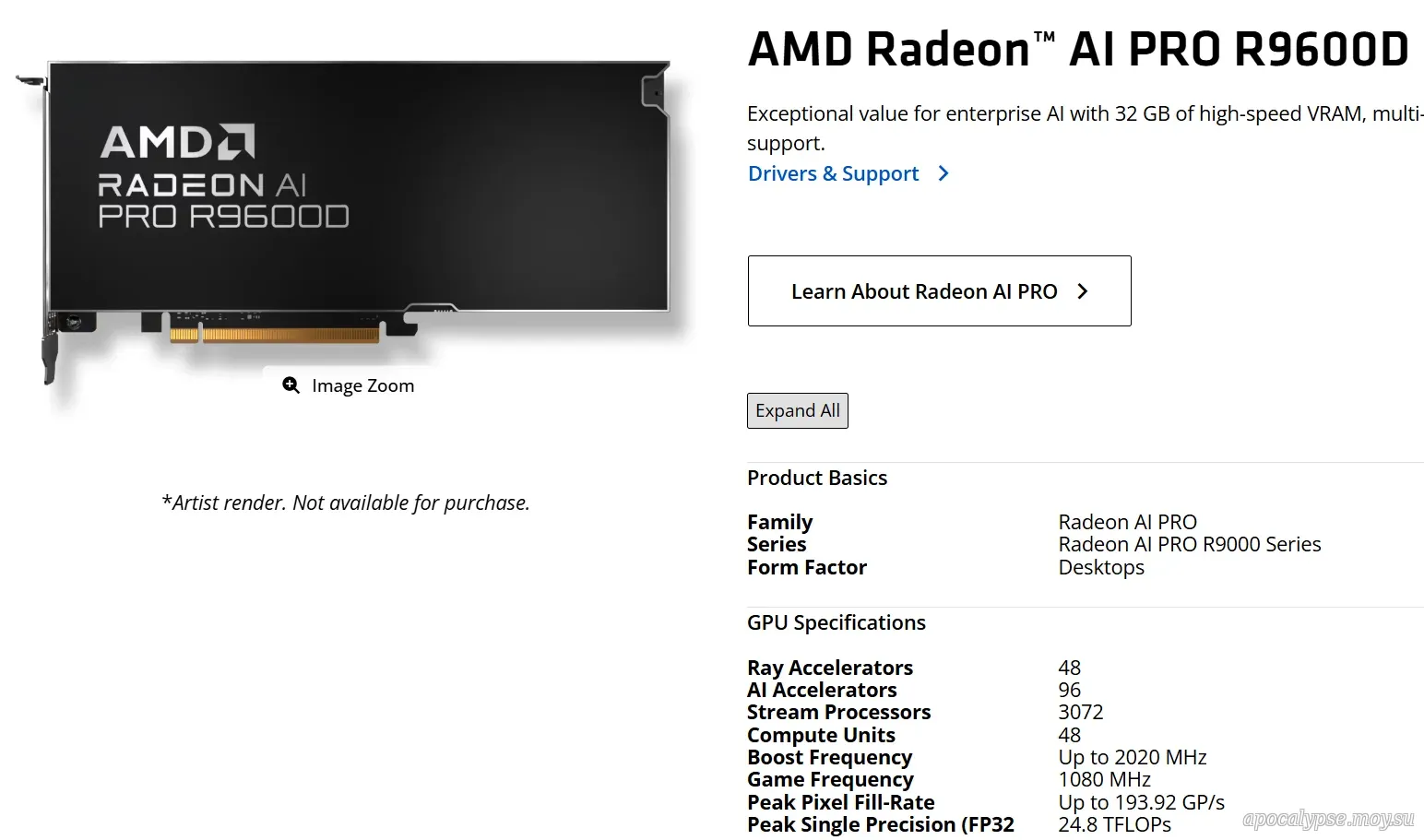 Модель Radeon AI Pro R9600D также построена на чипе Navi 48, но в его составе используются только 48 исполнительных блоков и 3072 потоковых процессора. В то же время карта сохранила 32 Гбайт видеопамяти с поддержкой 256-битной шины и пропускной способностью 640 Гбайт/с. Boost-частота графического процессора составляет 2020 МГц. Энергопотребление заявлено на уровне 150 Вт. Производительность в операциях FP32 составляет 24,8 Тфлопс. В целом конфигурация Radeon AI Pro R9600D похожа на игровую модель Radeon RX 9700 GRE для рынка Китая, но Radeon AI Pro R9600D имеет вдвое больше памяти. В отличие от Radeon AI Pro R9700S и AI Pro R9700, модель Radeon AI Pro R9600D оснащена активной системой охлаждения с одним вентилятором.